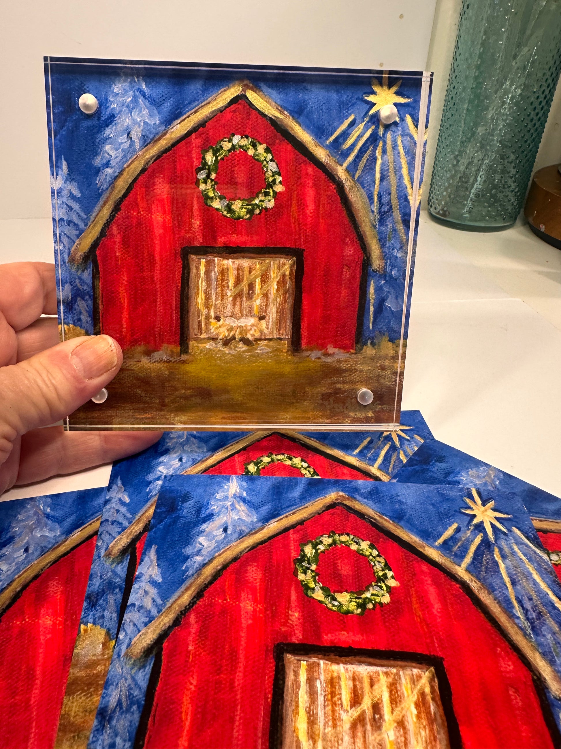 This is a fine art print of my original painting, featuring a vintage-style red barn nativity beneath a radiant star. Soft, expressive brushstrokes and delicate hand-painted gold details give the piece a gentle glow. Each hand-embellished print is finished by the artist, making every piece slightly unique.