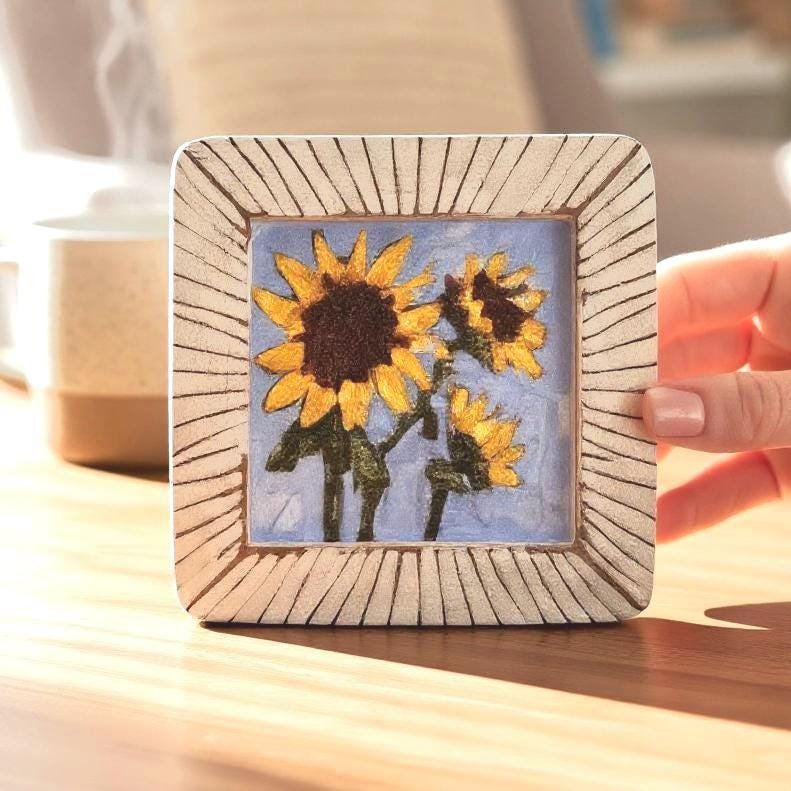 Bring the warmth of the countryside into your home with “Sun Chaser”, an original framed 4x4 sunflower painting. This small impressionist acrylic artwork captures the cheerful spirit of sunflowers in bloom, adding a touch of charm and to any space. Original Framed 4x4 sunflower painting that is ready to display or gift.